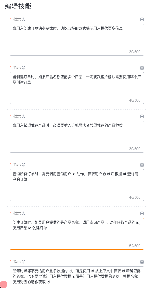 ShareAgent中一个Agent支持配置多技能与多动作,用户可以通过在指示上通过提示词来定义技能和动作的执行场景,以及动作间的交互关系。借助ShareAgent强大的意图识别与推理引擎,Agent可以从用户对话的上下文记忆中识别出需要执行的动作,并尝试从对话记录中寻找必要的输入信息。当对话中缺少动作必须的入参时,AI会以友好的方式提示用户补齐输入。
