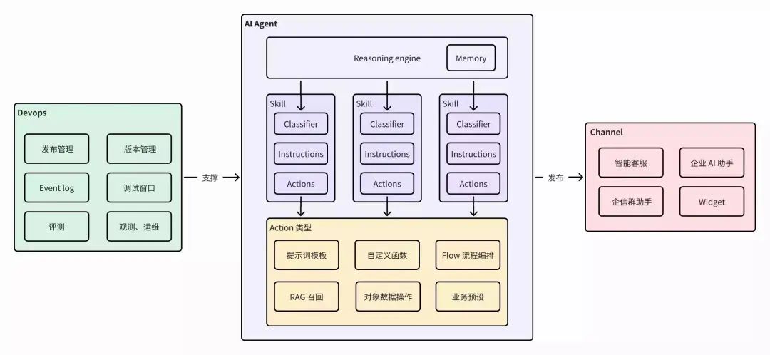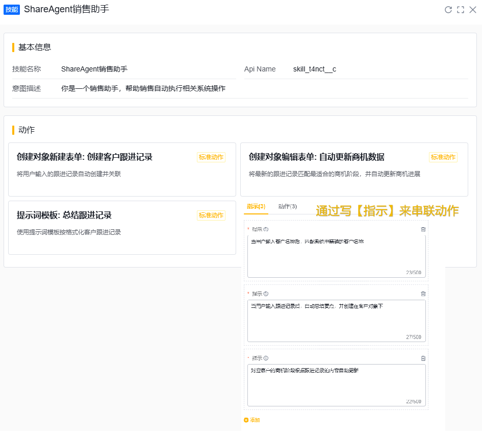 在进行Agent配置时,除了 CRM 内的预设操作外,还可接入流程、APL函数等更多租户级定制化能力,让租户的各种定制化能力在Agent中可复用,这是市面上Agent平台难以实现的功能。