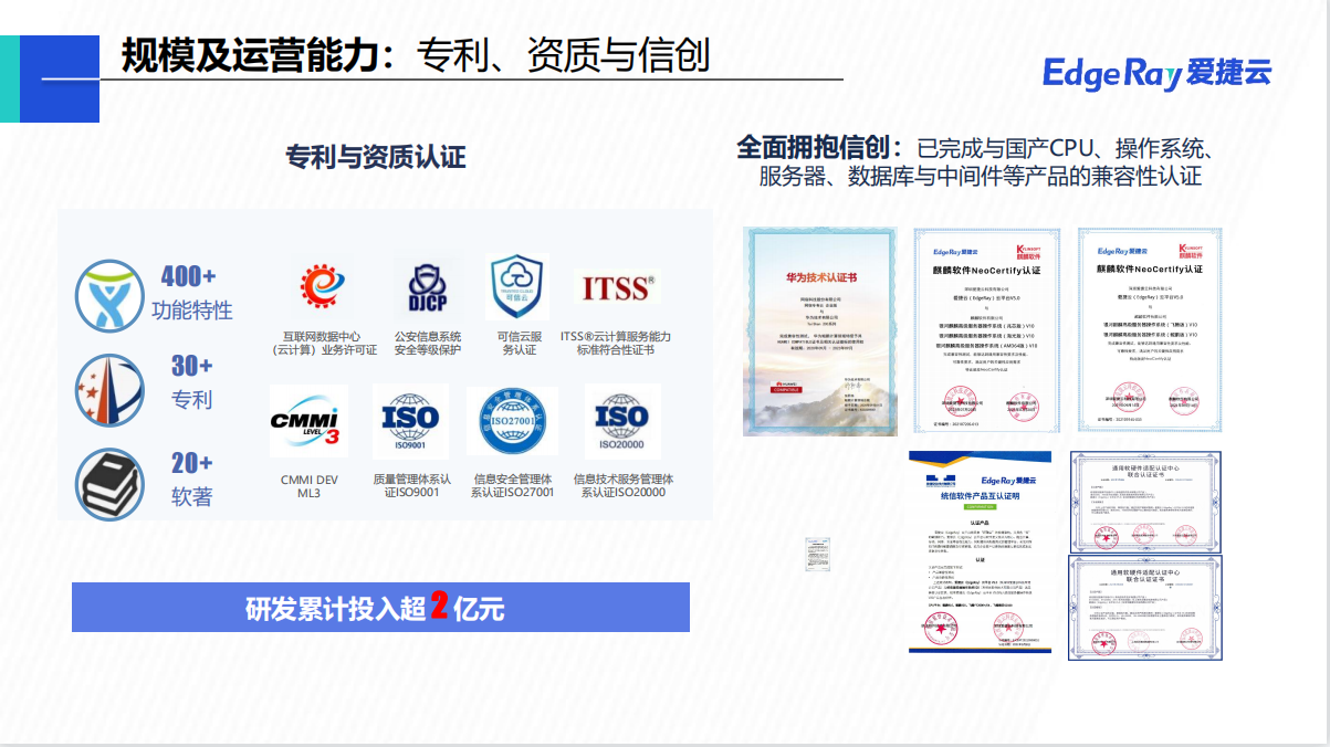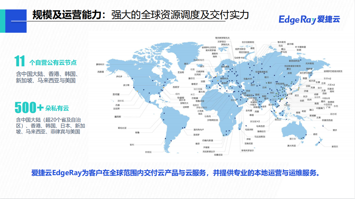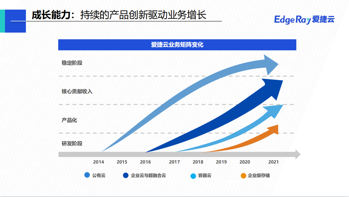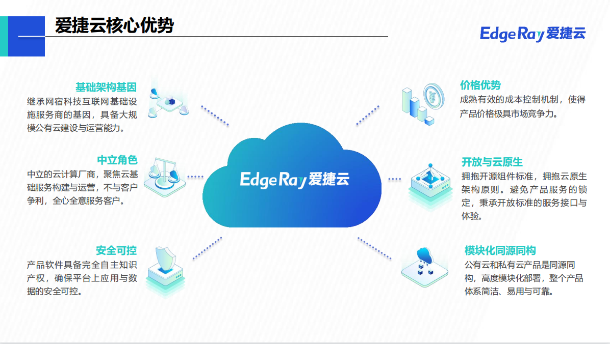 深圳爱捷云科技有限公司(EdgeRay)为全球领先的云分发公司网宿科技的控股子公司,是中立可靠的云计算公司。公司以统一架构为客户提供从轻量的超融合云到超大规模的全栈企业云产品及服务,满足客户公有、私有、混合及托管等灵活多样的部署需求。通过简化IT基础架构,爱捷云帮助客户稳定高效运行业务及应用程序,并有效降低IT总体拥有成本,助力客户专注于业务及应用创新,帮助教育、医疗、制造、金融、政务、媒体、互联网、能源、交通等千行百业实现数字化转型。企业愿景Cloud Your Way 让每一家企业都能自主选择灵活上云全球500+客户选择了爱捷云