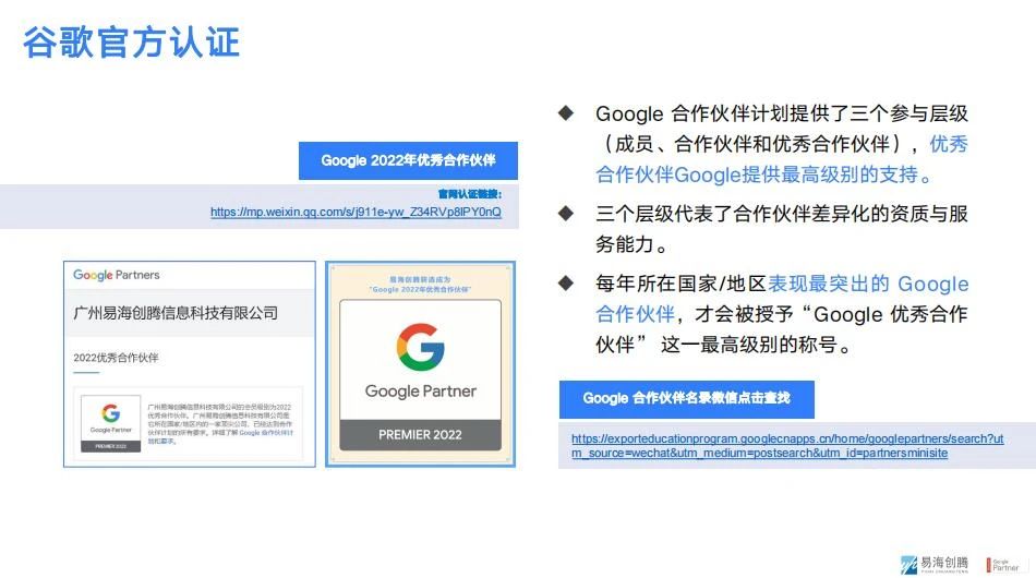 Google出海体验中心项目是谷歌针对中国跨境电子商务战略性项目,旨在帮助中国品牌推向国际市场。2017年,谷歌授权核心合作伙伴——广州易海创腾信息科技有限公司,运营“广州Google出海体验中心” ,经由花都区政府引进, “广州Google出海体验中心”正式落户花都区名高城,成为全国首家 2.0级别的Google出海体验中心。目前,拥有超百人的优秀团队,已助力1000多家企业成功扬帆海外,找到全球买家。