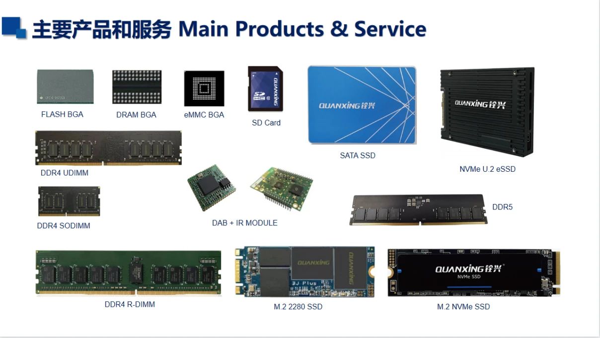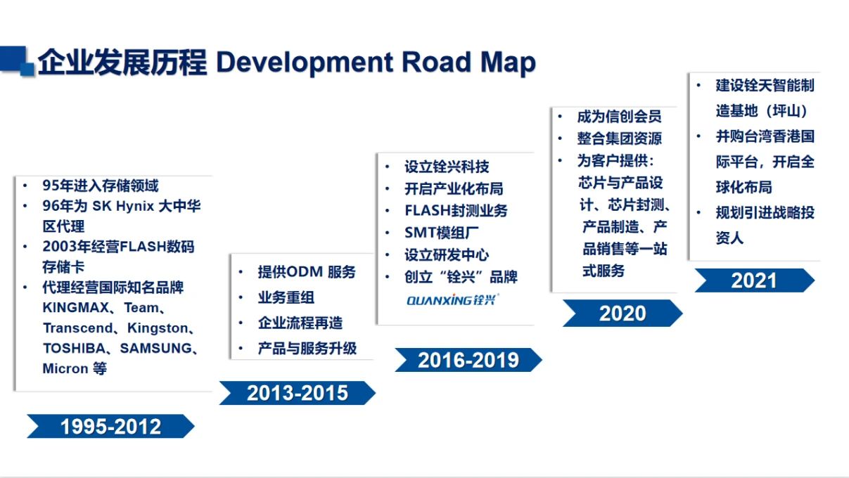 铨兴科技拥有存储芯片封测厂和自动化模组生产工厂,并引进全球高端人才与国内知名高校学者共同组建研发技术团队。核心运营团队深耕半导体存储行业25年,积累了丰富的行业资源与经验。2015年起开始涉足制造;2019年创⽴国产品牌“QUANXING铨兴”;2020年加入中国电子工业标准化技术协会成为信创会员,完成国产半导体存储的全产业链布局。公司产品和服务包括存储芯片封测服务、DRAM内存模组、SSD固态硬盘、数码存储卡、U盘以及客制化服务等。25年的砥砺奋进,铨兴科技秉承着厚积薄发的精神,加大投资力度新建国际一流水平的智能制造工厂,致力发展成为行业领先者,为半导体存储产业国产化尽一份心力!让铨兴科技誉满中国、走向世界!