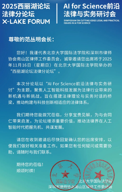 4. 2025年11月16日,协会执行会长范丛明受邀参加2025西丽湖论坛法律分论坛:AI for Science前沿法律与实务研讨会。