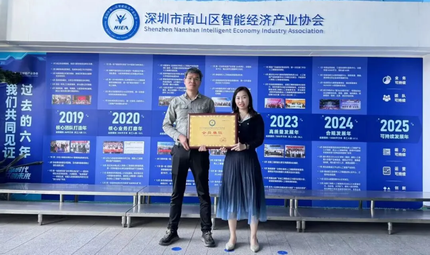 31. 2025年11月25日,会员单位东莞市江涵电子有限公司总监张中明一行到访协会,受到深圳市南山区智能经济产业协会轮值会长杨诗虹的热情接待,并颁发会员牌匾。