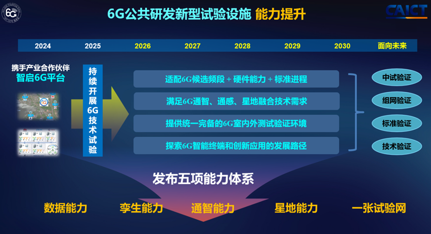 大会期间,IMT-2030(6G)推进组宣布6G公共研发新型试验设施能力提升,基于现有6G技术试验平台,携手业界全面提升五项能力体系,以数据为基础,构建数字孪生底座,创新通智融合、星地融合能力,共筑一张试验网,助力6G关键技术和样机研发、支撑国际标准研制、服务创新生态应用。