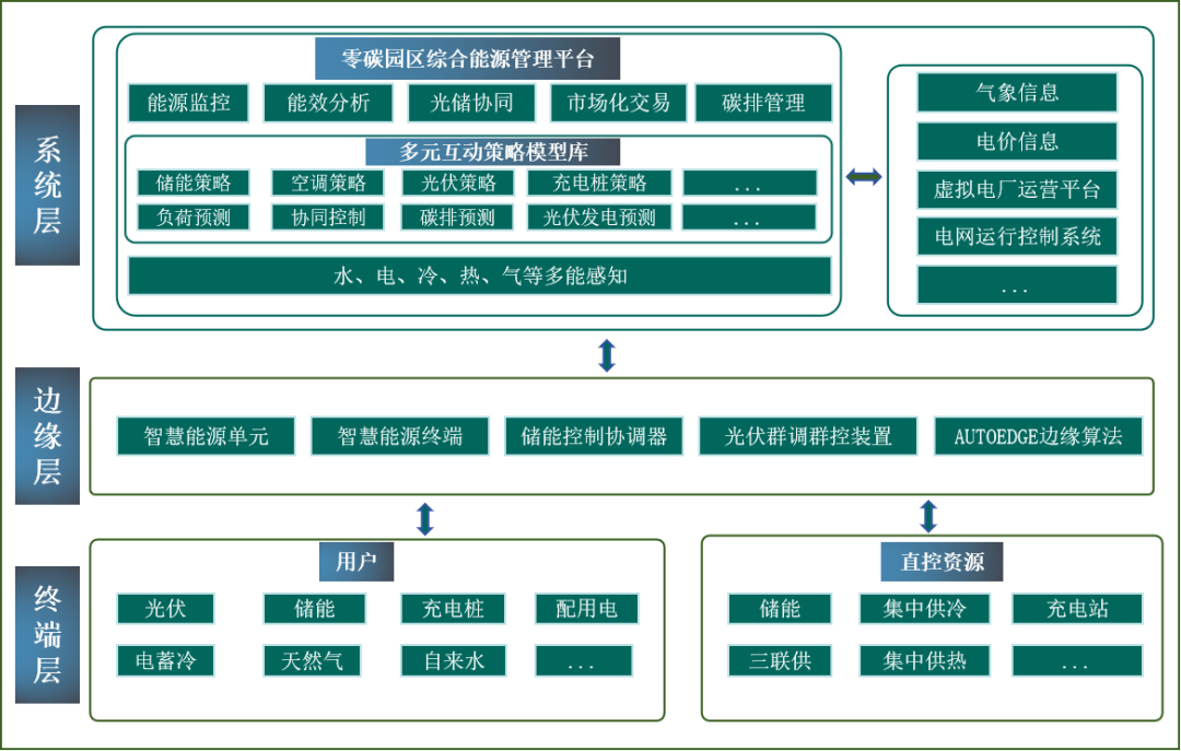 零碳园区综合能源管理平台采用系统层-边缘层-终端层三层架构设计,通过各层级协同联动,实现园区冷、热、电、气等多种能源的高效管控与优化运行。