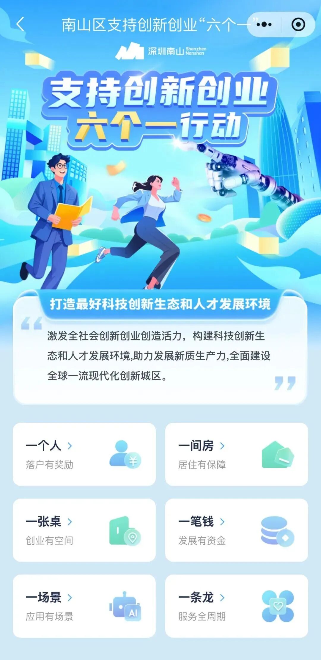 今年3月,南山首版“六个一”行动方案推出,从“欢迎一个人、安置一间房、提供一张桌、支持一笔钱、开放一场景、服务一条龙”六个维度,为创新创业主体提供一揽子支持,迅速在企业和人才中形成口碑。