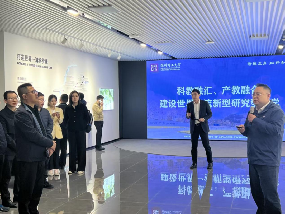 在深圳理工大学科研产业处处长、生物医学工程学院特聘教授张鹏的带领下,协会执行会长范丛明一行参观了深理工展厅,深入了解深圳理工大学在创立背景、办学理念、学科建设情况、发展定位、办学模式、人才培养模式、办学成果以及产教融合的典型案例等,让大家对深圳理工大学在人工智能及相关领域的技术突破与发展趋势有了更清晰的认识。