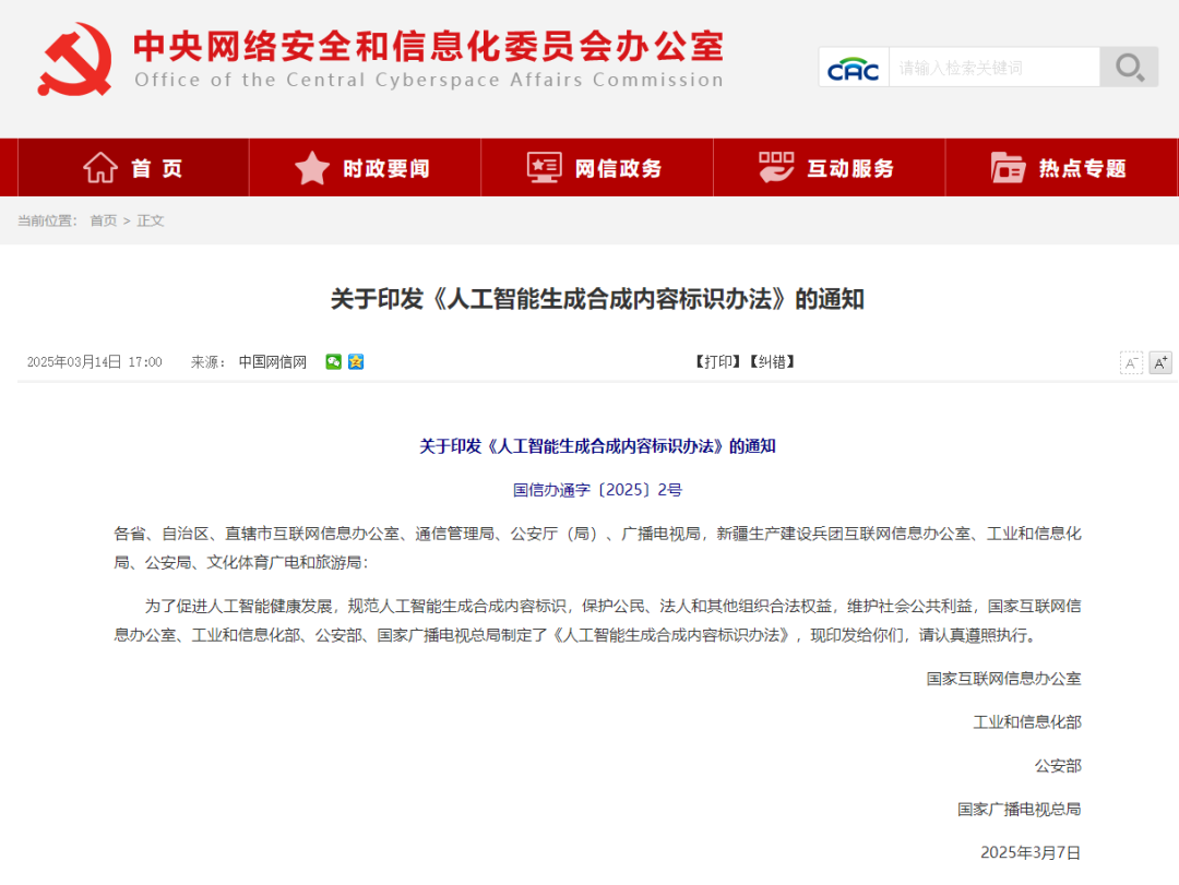 近日,国家互联网信息办公室、工业和信息化部、公安部、国家广播电视总局联合发布《人工智能生成合成内容标识办法》(以下简称《标识办法》),自2025年9月1日起施行。国家互联网信息办公室有关负责人表示,《标识办法》旨在促进人工智能健康发展,规范人工智能生成合成内容标识,保护公民、法人和其他组织合法权益,维护社会公共利益。