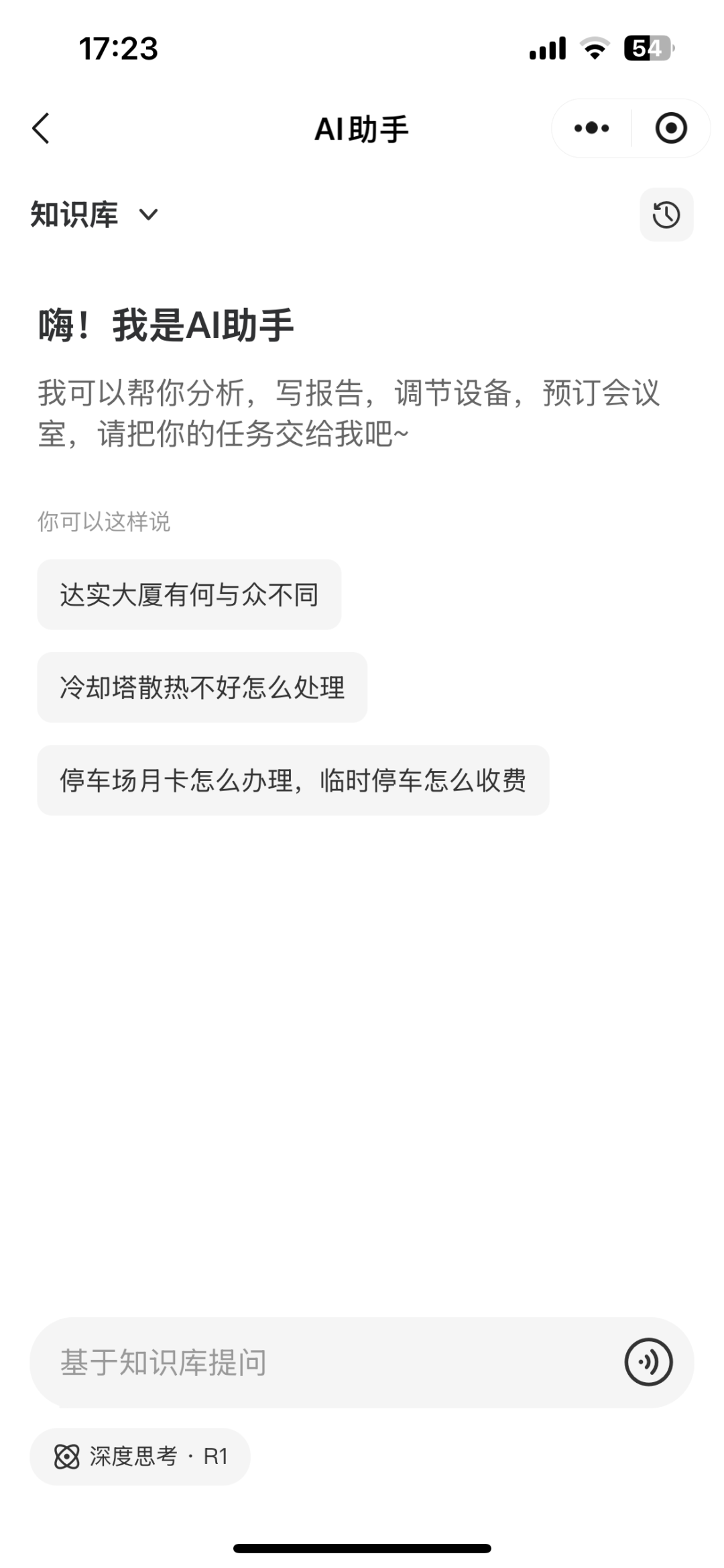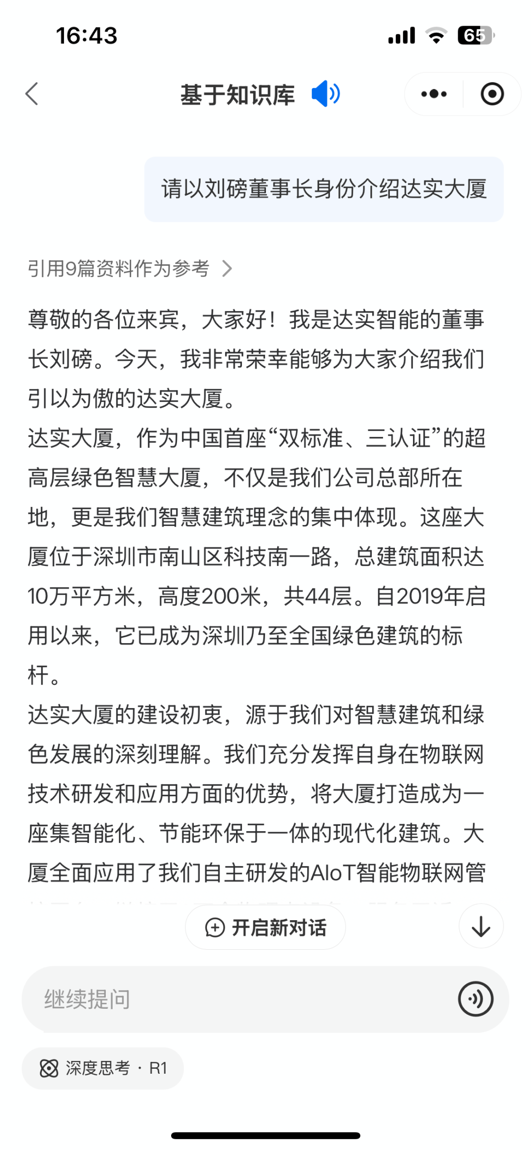 AI助手从知识库中检索了与达实大厦相关的信息并组织成文本,调用语音工具模拟董事长的声音进行播报,声音仿真度较高。