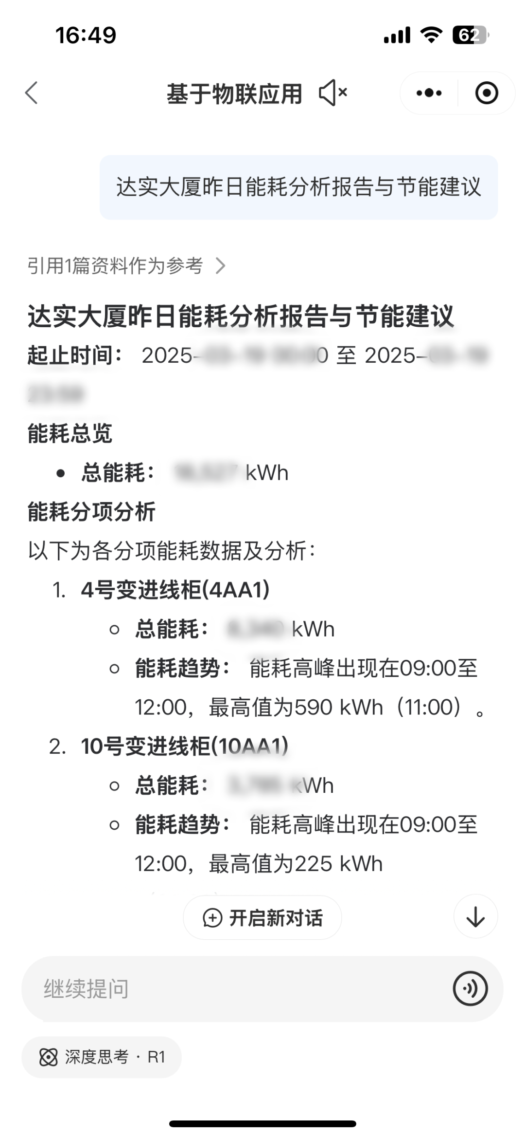 AI助手查询并给到的能耗情况和节能建议,它会先拆解业务数据,了解需要查询电表数据,并做能耗分项,对节能建议是重点分析能耗较高的电表及相关设备。