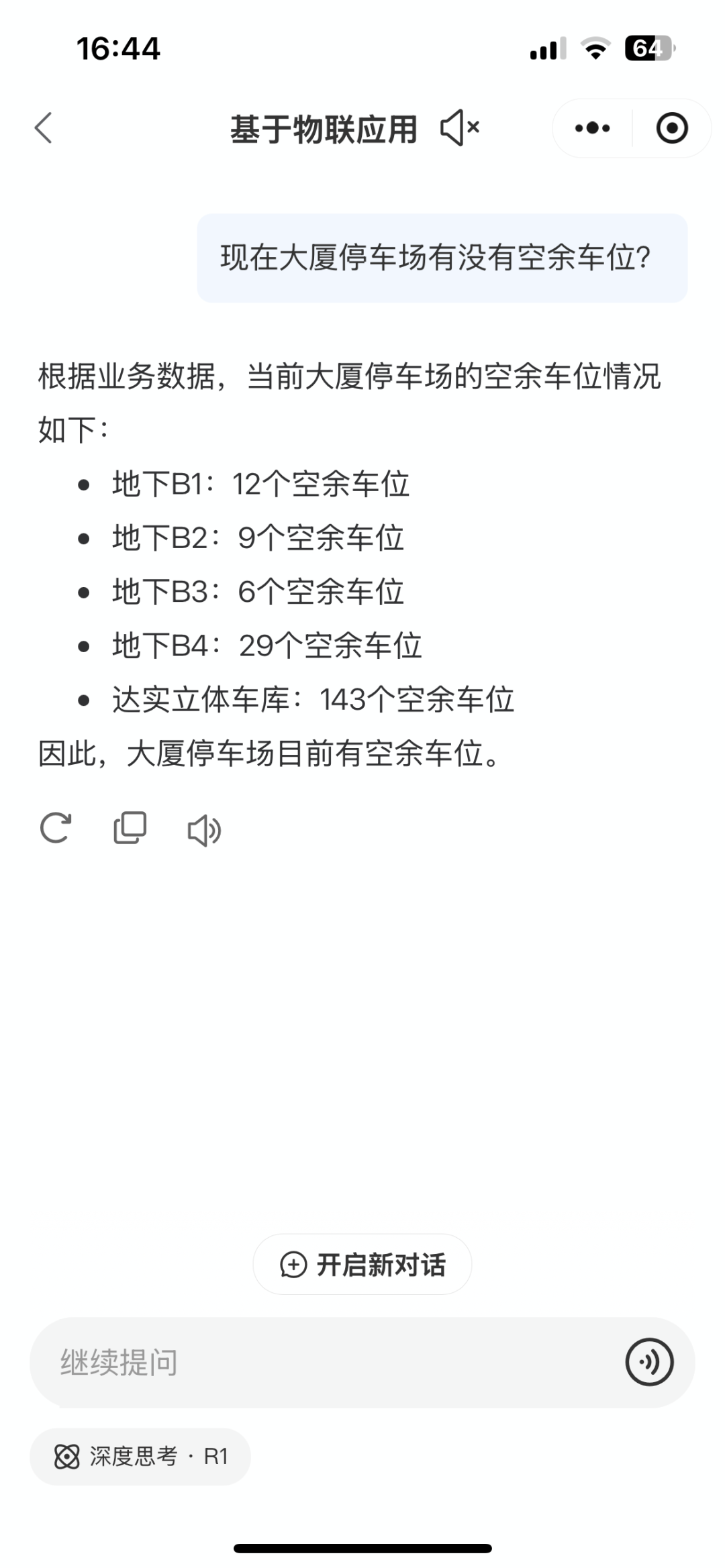员工的意图能被准确地识别到,当前大厦停车场从地下从-1到-4,车位有多少个,立体停车库有多少个车位,都能一一呈现。