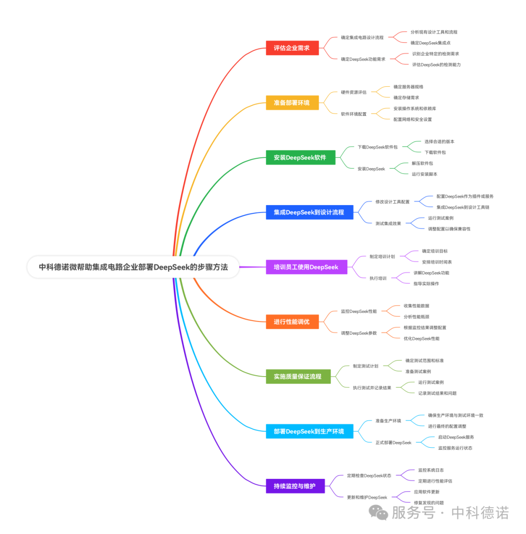 面向集成电路行业合作伙伴,德诺微将帮助集成电路行业产品实现Risc-V的研制,简称R化。同时辅助企业完客户端生态圈的鸿蒙化部署,简称鸿化。目前由于人工智能行业的迅猛发展,德诺微联合华为帮助集成电路企业部署DeepSeek以帮助企业进一步完善研发端的降本增效、降低开发门槛,企业可利用丰富的API接口进行二次开发,推动技术创新。具体实施可参考以下步骤: