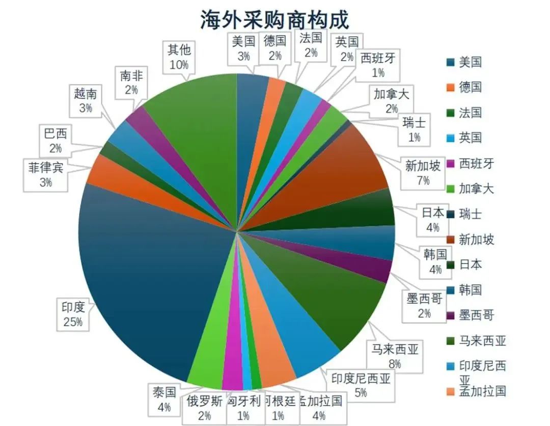 覆盖范围广:来自美国、德国、日本、新加坡、印度、马来西亚等 30 余个国家和地区,其中印度(25%)、马来西亚(8%)、日本(7%)、新加坡(7%)等亚太国家和地区占比突出,彰显深圳 AI 技术在亚太市场的核心影响力;欧美市场中,美国、德国采购商占比均达 3%,反映出全球对中国 AI 产业化成果的高度关注。