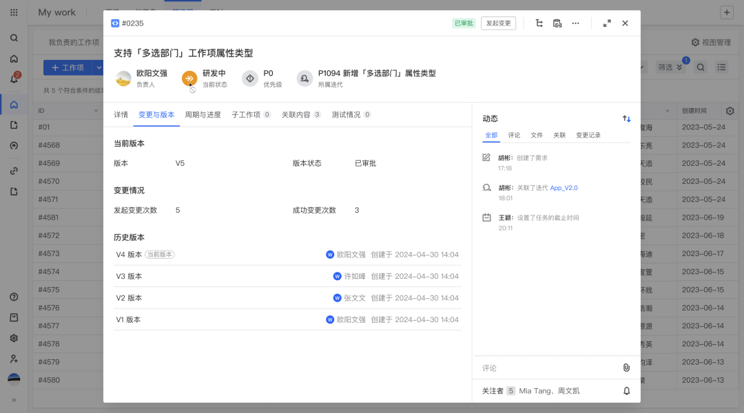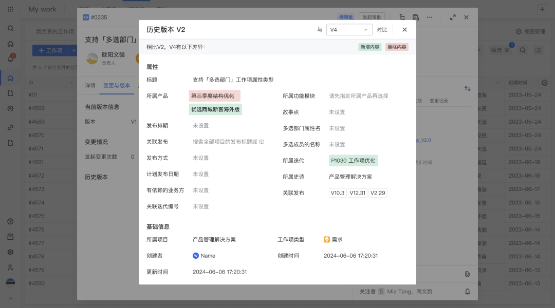 每次审批通过之后都会创建工作项的历史版本,可以对历史版本进行对比,查看每个版本具体变更的内容。