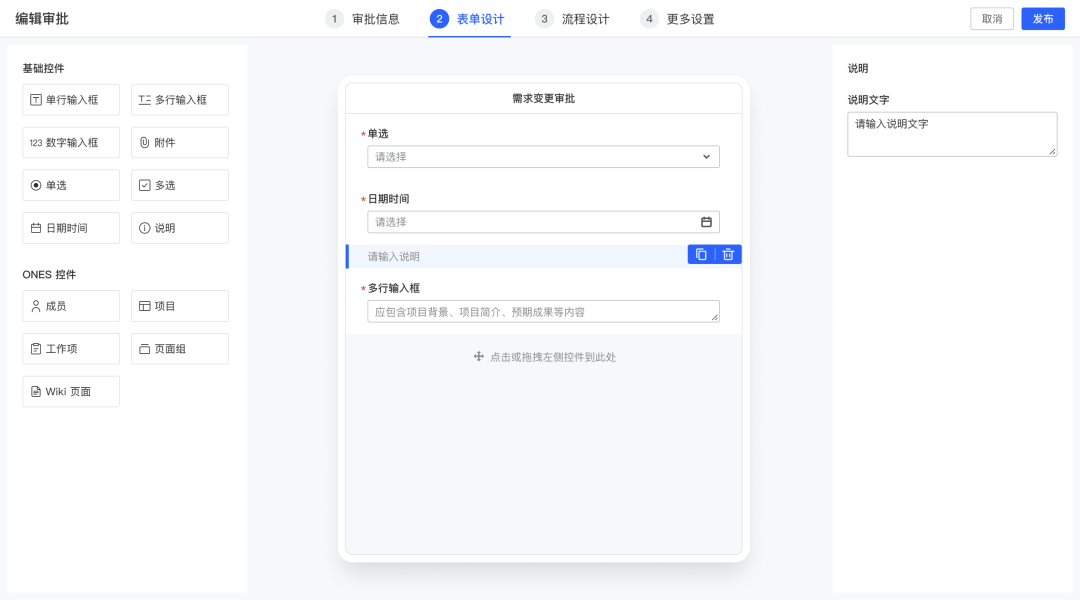 支持使用单/多选、输入框、附件、成员、项目、工作项等控件来搭建审批表单,以便在发起审批的时候能够输入必要信息。