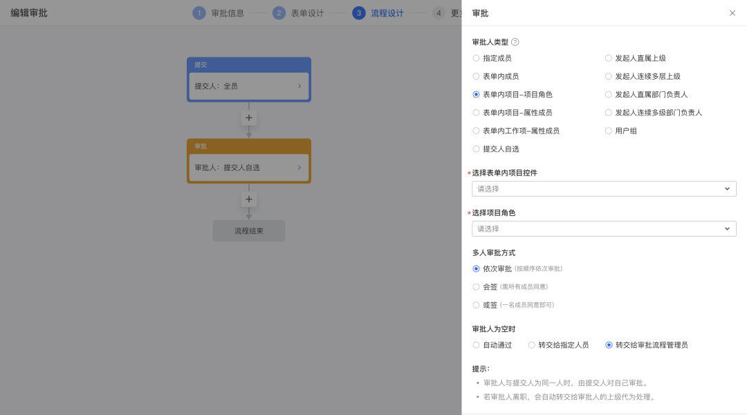 支持设置动态审批人,例如发起人的上级、发起的部门负责人、工作项属性成员等,能够根据发起人及表单内容动态分配审批人,以便能够更贴合业务场景。