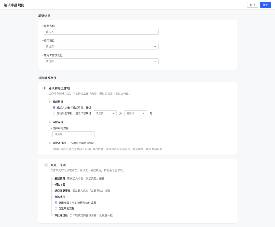 支持创建工作项审批规则,自定义审批规则应用范围,配置工作项冻结属性。