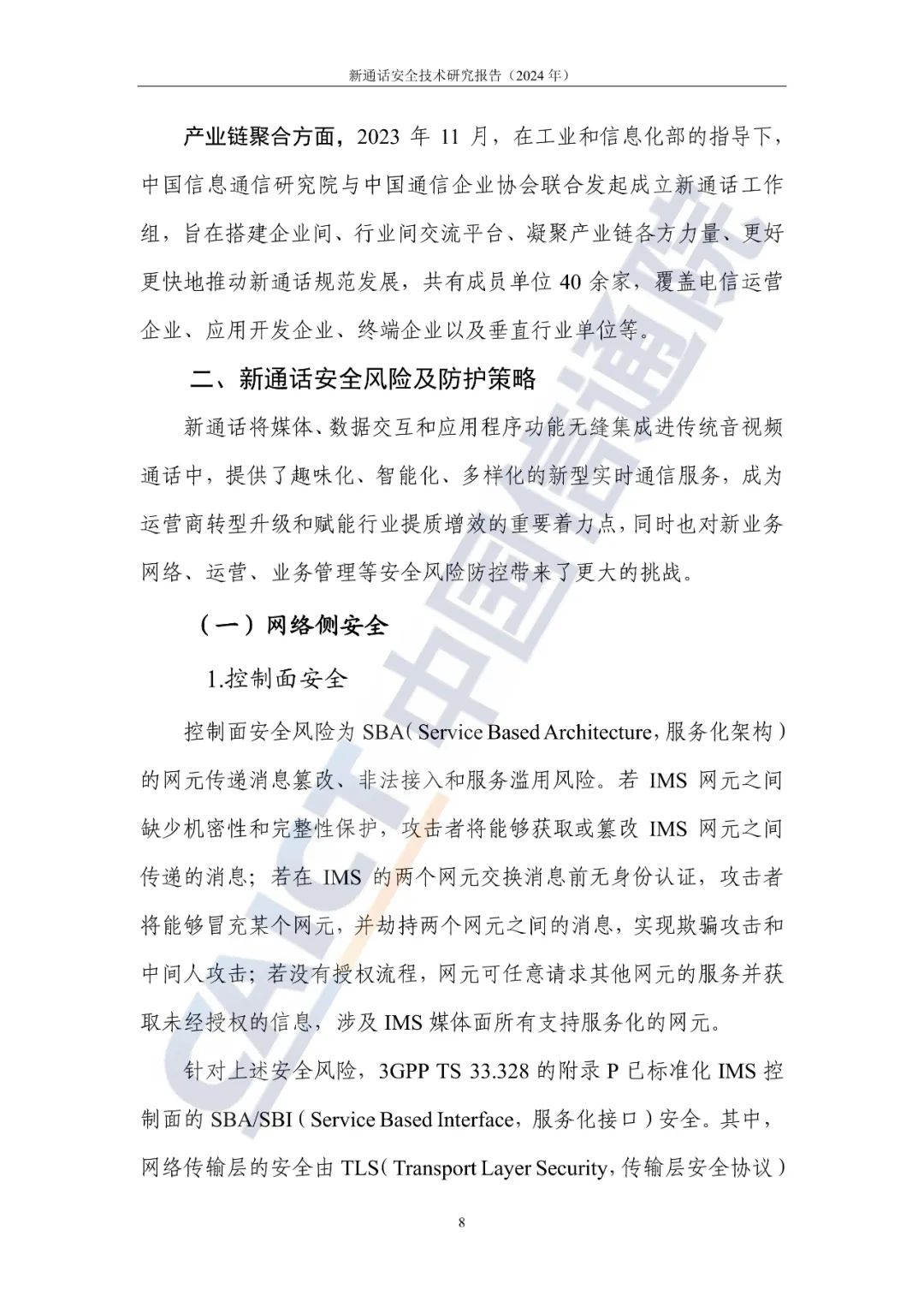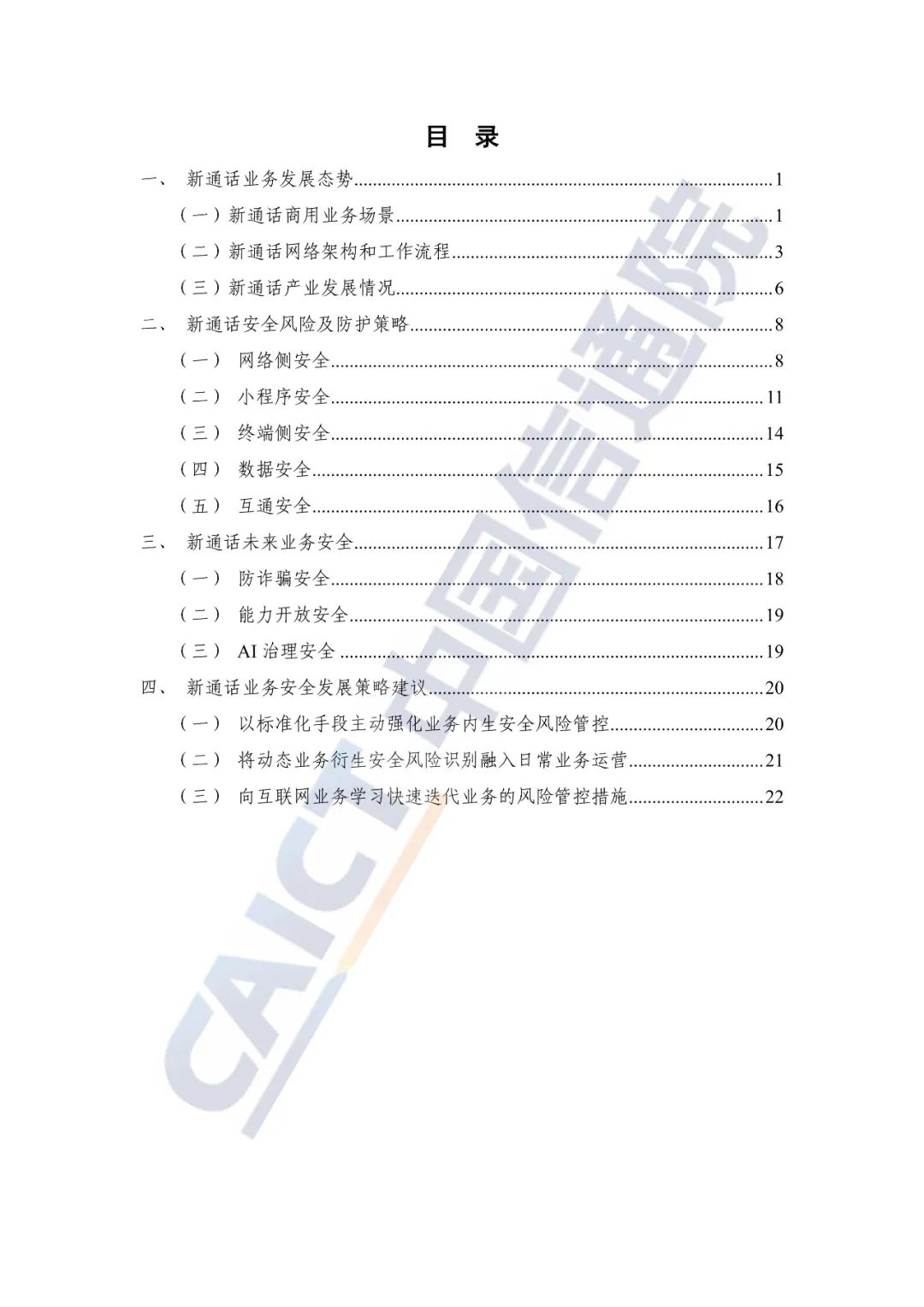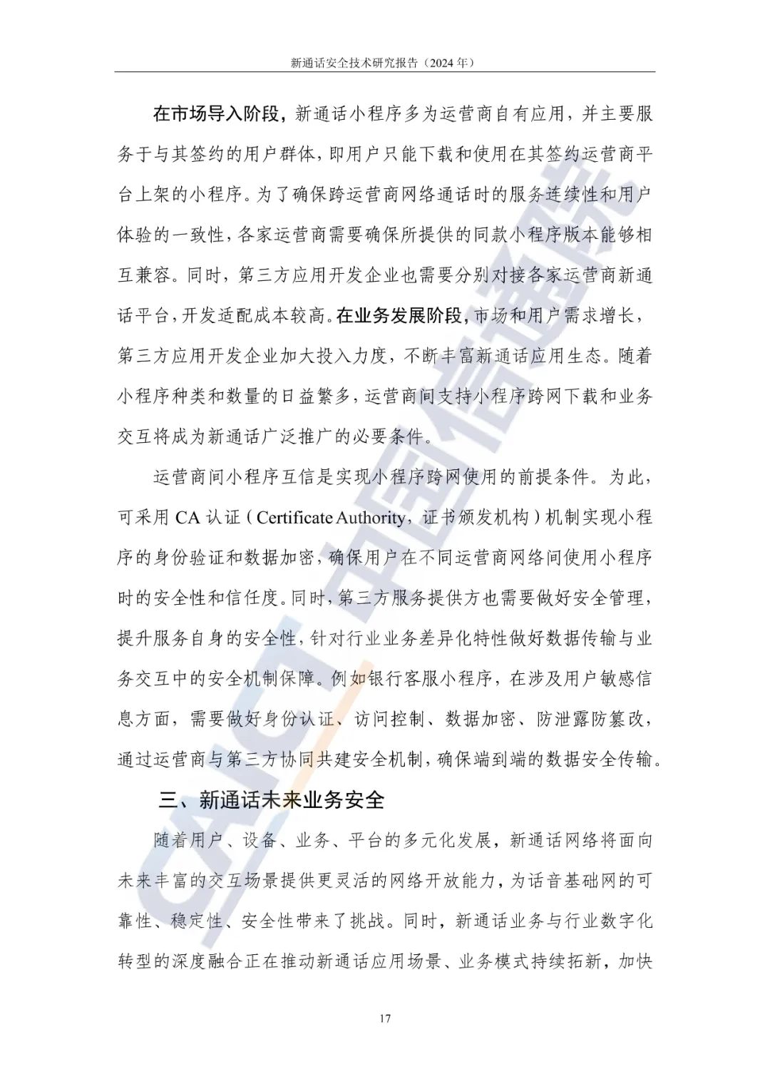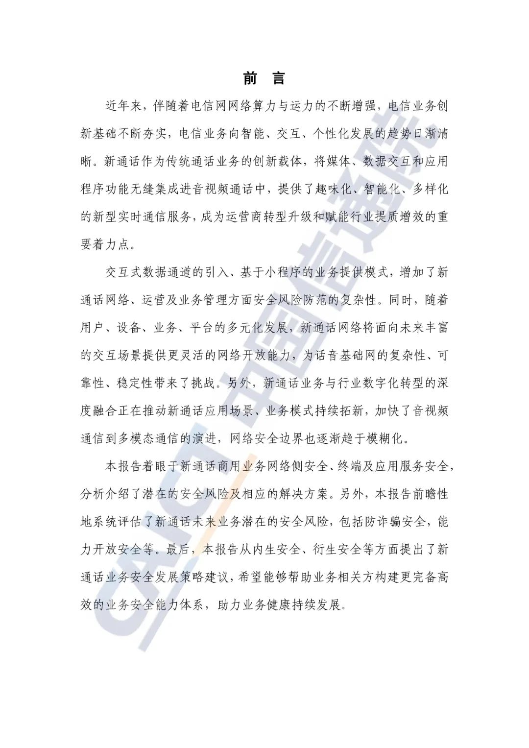 围绕新通话商用业务对应的网络侧安全、终端及应用服务安全诉求,当前3GPPICCSA已制定了相对全面的安全标准体系,同时业界小程序和应用最佳安全实践已完备,具备充分保护个人用户和数据安全的能力,能够为新通话商用业务保驾护航。针对新通话未来业务面临的安全挑战,包括防诈骗安全,能力开放安全等,亟需各产业联合定义,推动标准和生态完备建设。