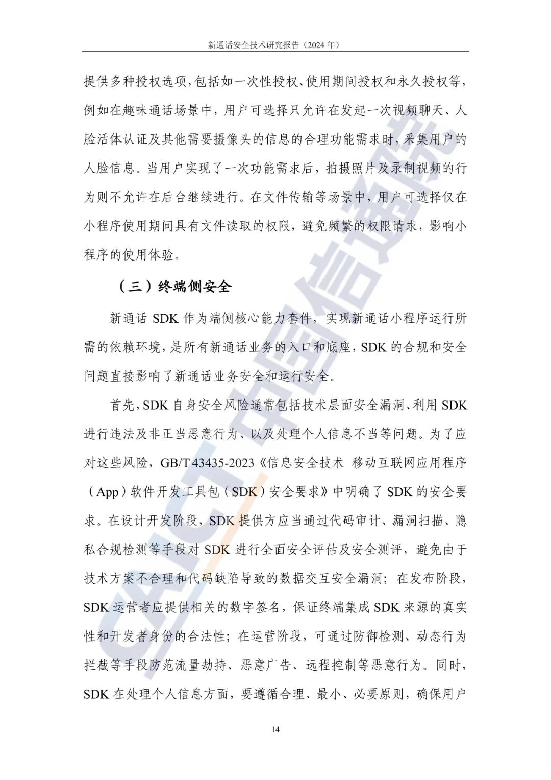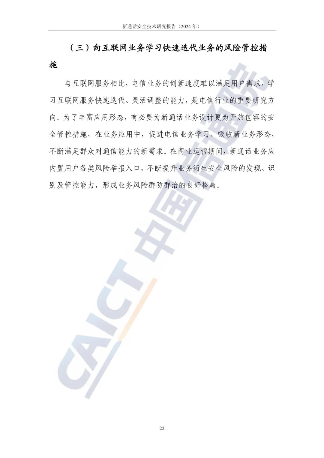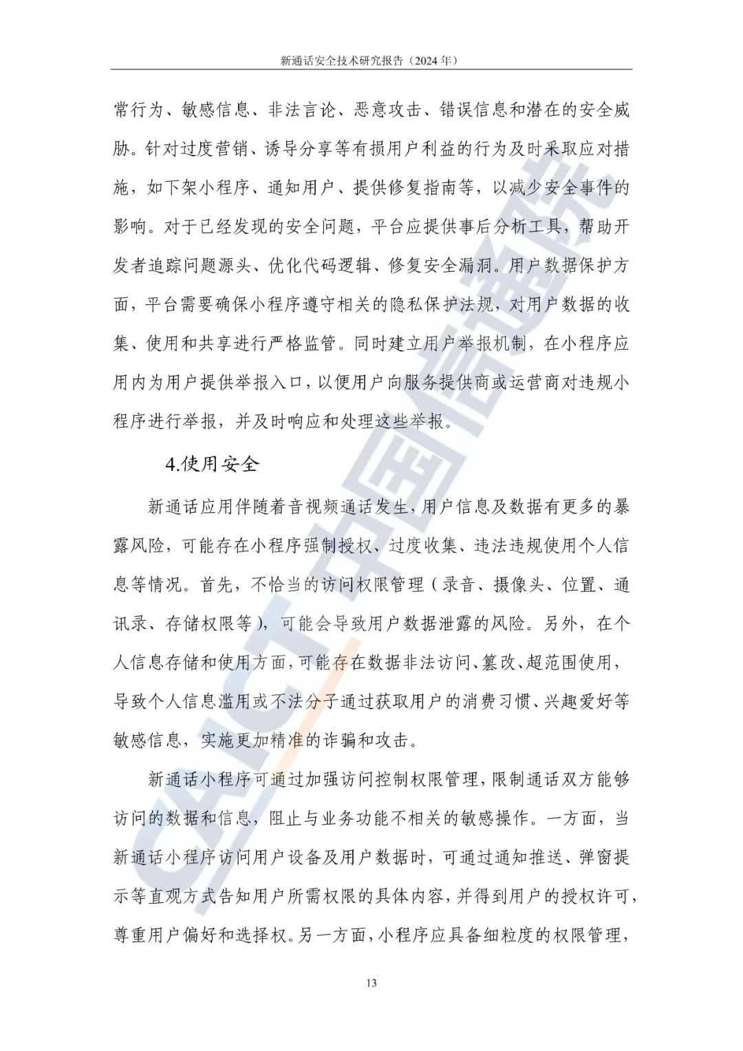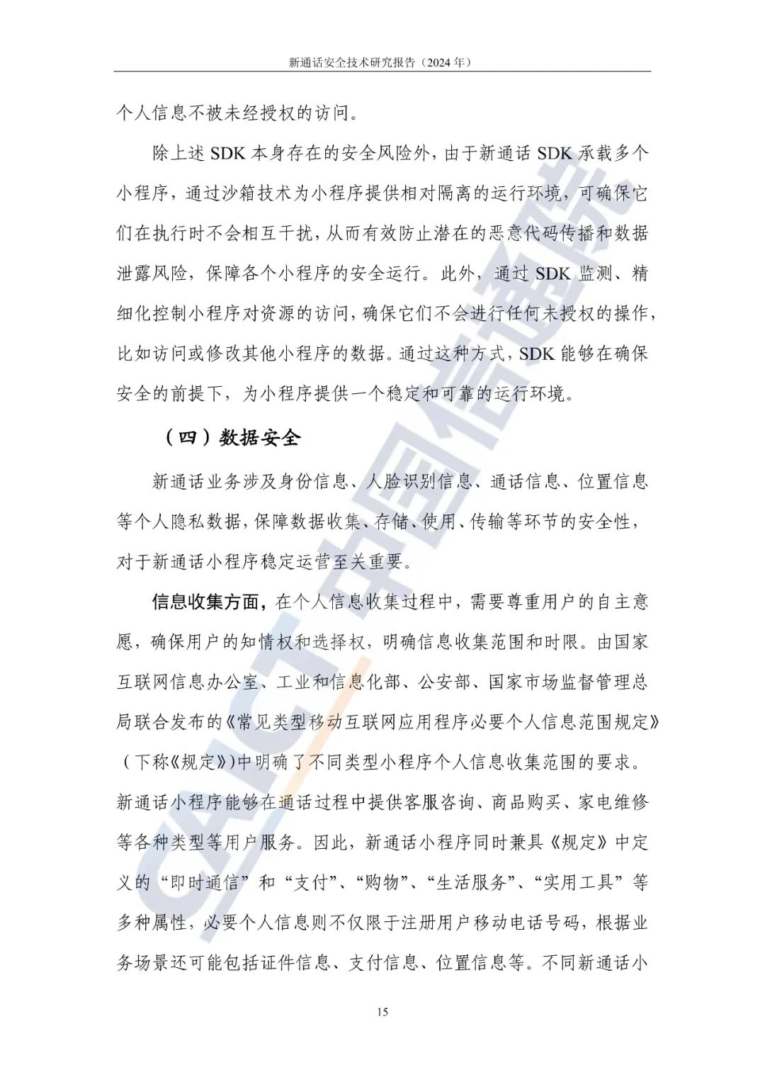 围绕新通话商用业务对应的网络侧安全、终端及应用服务安全诉求,当前3GPPICCSA已制定了相对全面的安全标准体系,同时业界小程序和应用最佳安全实践已完备,具备充分保护个人用户和数据安全的能力,能够为新通话商用业务保驾护航。针对新通话未来业务面临的安全挑战,包括防诈骗安全,能力开放安全等,亟需各产业联合定义,推动标准和生态完备建设。