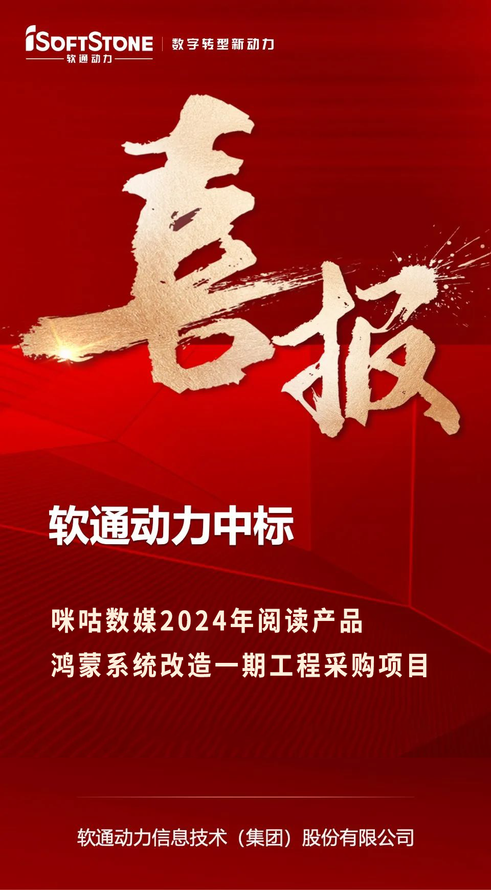 近日,软通动力成功中标咪咕数字传媒有限公司(以下简称“咪咕数媒”)2024年阅读产品鸿蒙系统改造一期工程采购项目。该项目旨在对咪咕数媒阅读产品进行鸿蒙化改造,助力其打造智能、安全且便捷的全新阅读体验。
