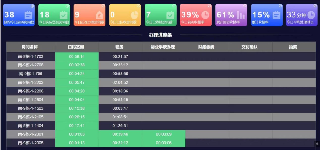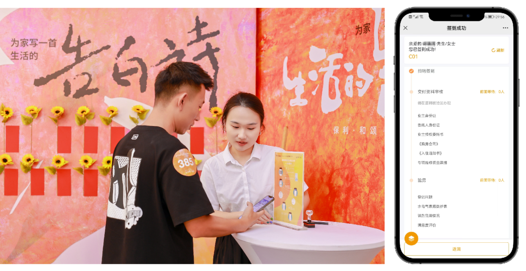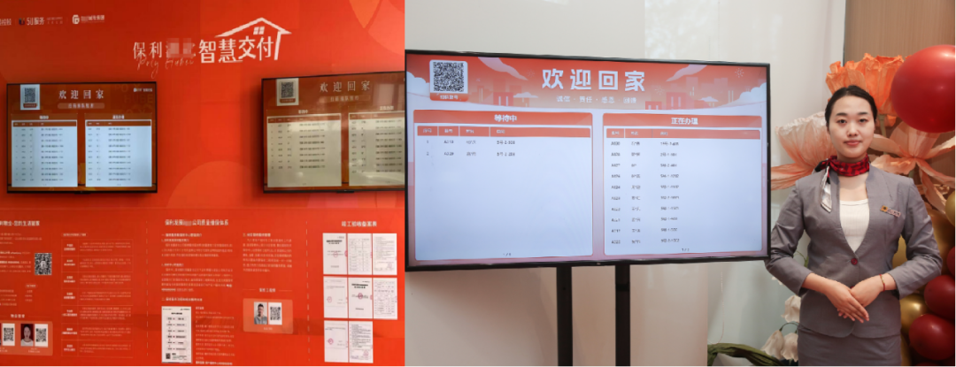 例如黄石保利时代、石家庄的保利城项目在陪同验房及签约等候环节,特别增设了叫号大屏系统,通过扫码签到即刻加入排队序列,随后便可安心等待叫号,不但如此还能实时查看自己的交房进度,后续办理流程,井然有序的步骤呈现,有效缓解了客户等待焦虑。