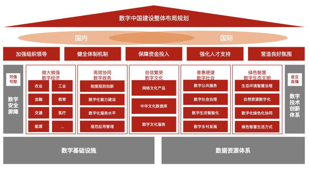 建设数字中国是数字时代推进中国式现代化的重要引擎,是构筑国家竞争新优势的有力支撑。2023年2月,中共中央、国务院印发《数字中国建设整体布局规划》,明确数字中国建设按照“2522”的整体框架进行布局,即夯实数字基础设施和数据资源体系“两大基础”,推进数字技术与经济、政治、文化、社会、生态文明建设“五位一体”深度融合,强化数字技术创新体系和数字安全屏障“两大能力”,优化数字化发展国内国际“两个环境”。