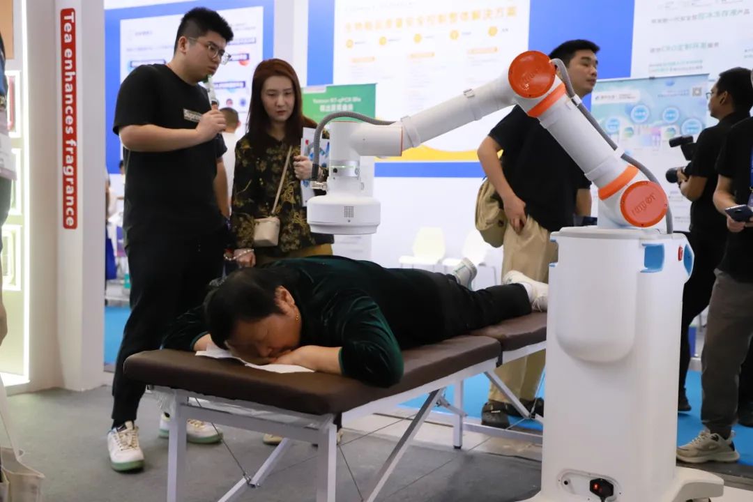 其中大型医疗设备频谱光波治疗房、热垫式治疗仪,以及全新科技产品:茶人石墨烯养护柜、智能悬灸机器人、石墨烯渗透导入仪等全新亮相。