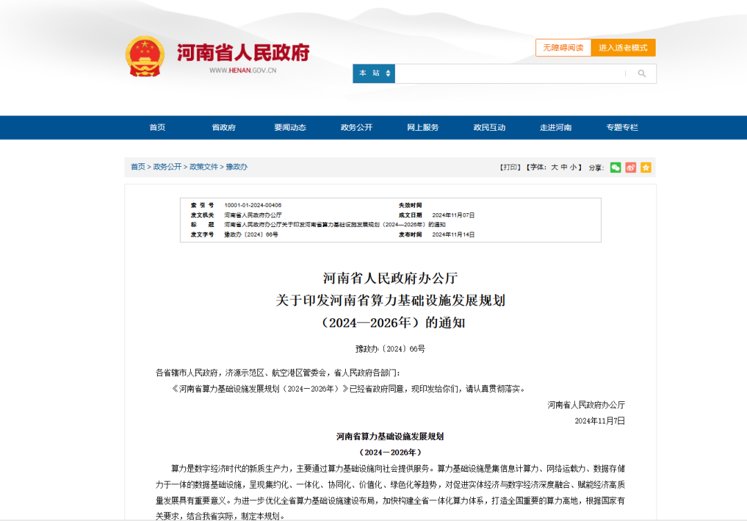 11月14日,河南省人民政府办公厅发布了《河南省算力基础设施发展规划(2024—2026年)》(以下简称《规划》),旨在构建全省一体化算力体系,打造全国重要的算力高地。