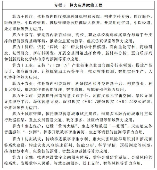 强化算力赋能。面向教育、文旅、政务、科研、金融等场景需求,积极推广算力应用解决方案,打造一批可复制、可推广的典型应用案例。围绕医疗、农业、交通运输、物流等优势行业,推动垂域行业大模型建设,打造“算力、算法、数据”的生态闭环。