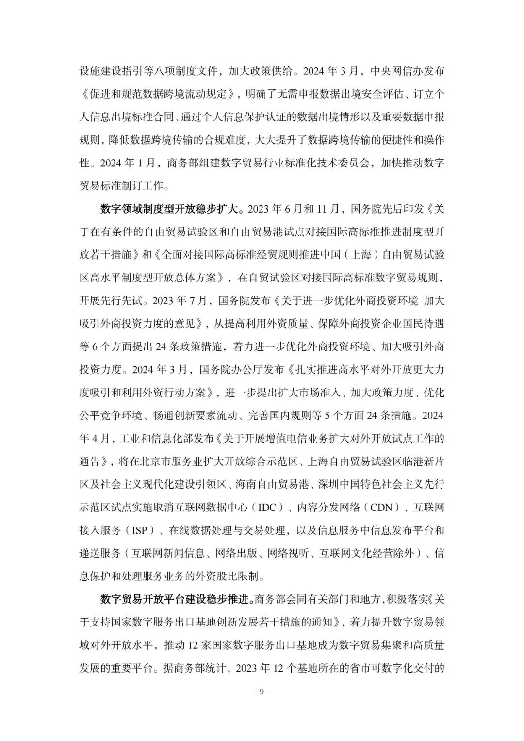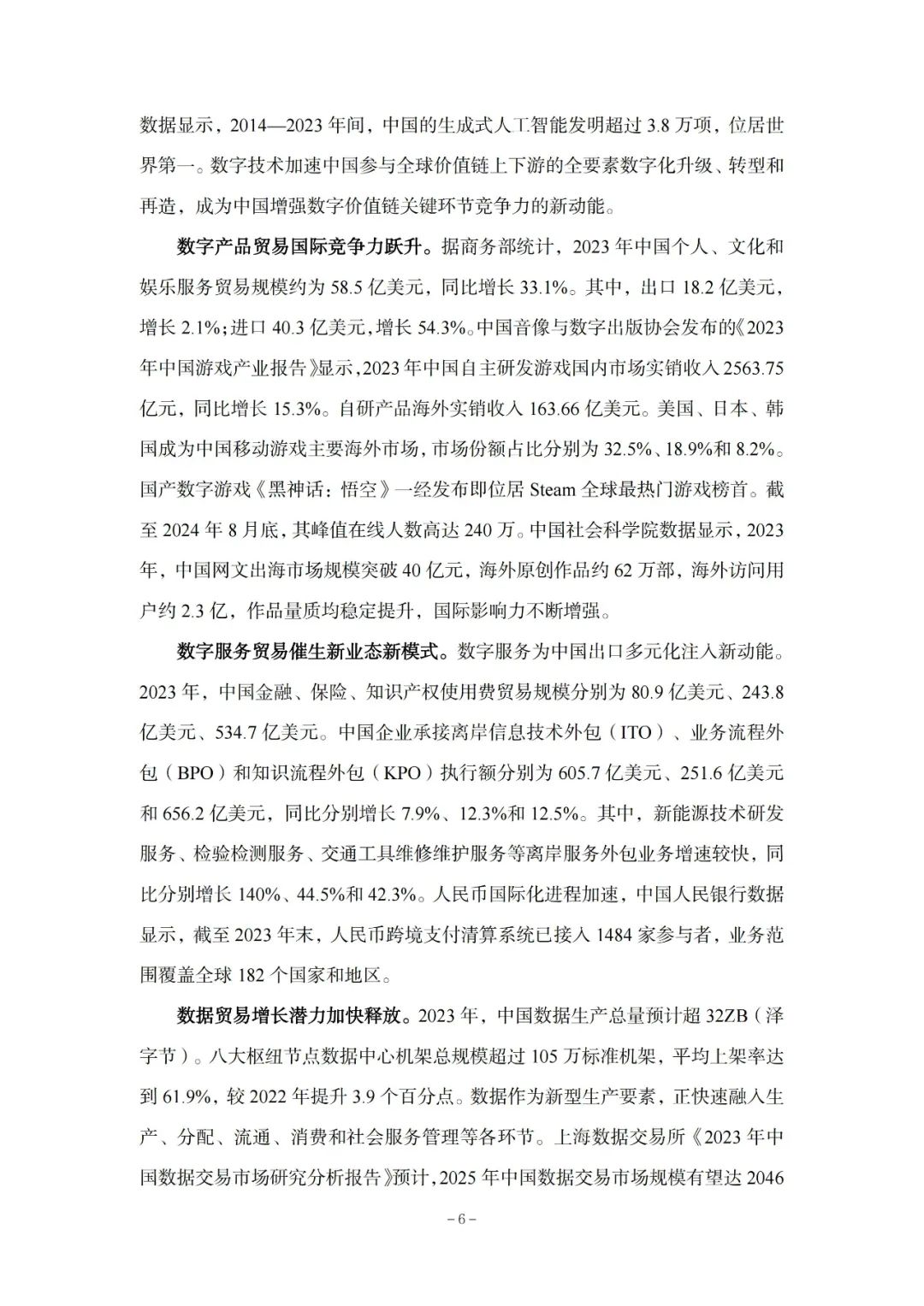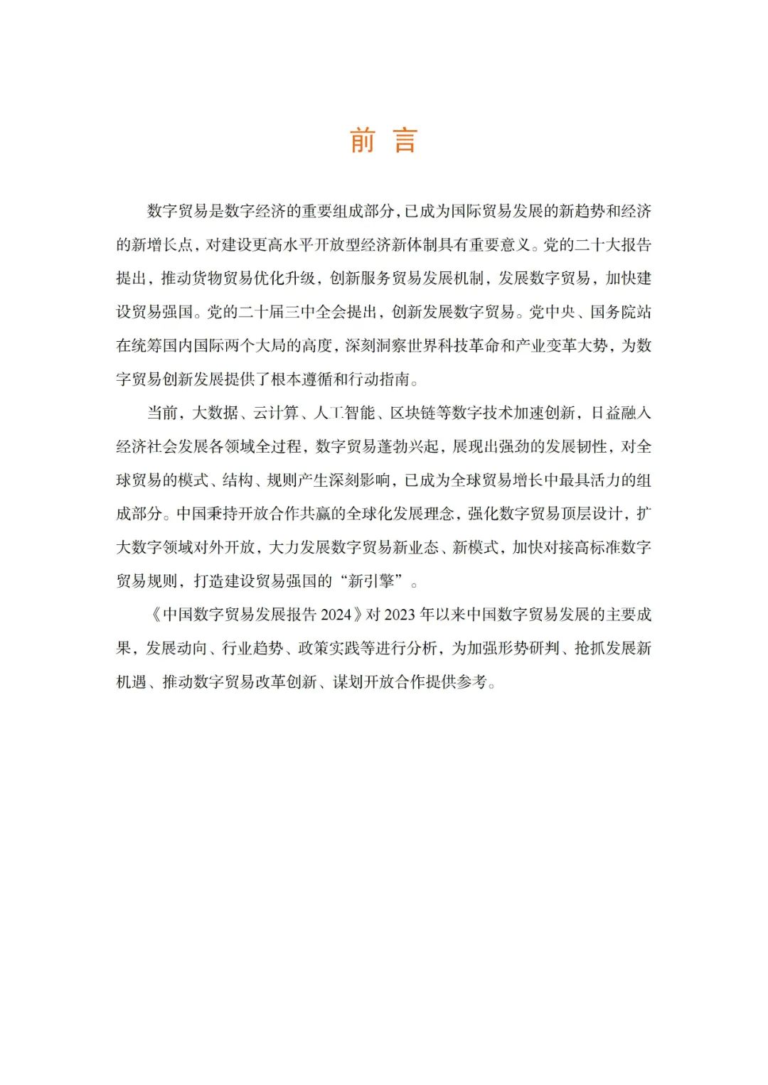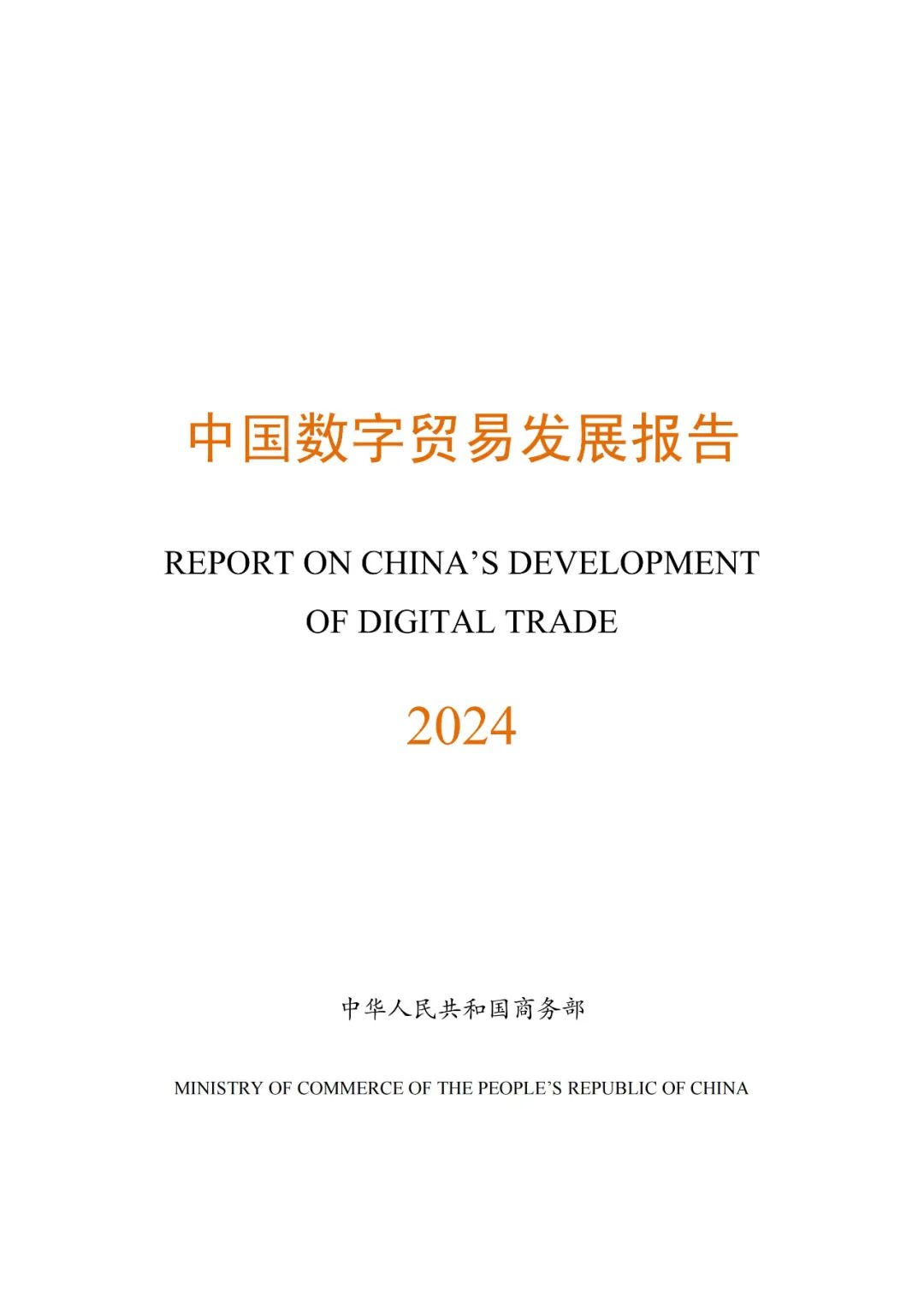 《中国数字贸易发展报告 2024》对 2023年以来中国数字贸易发展的主要成果,发展动向、行业趋势、政策实践等进行分析,为加强形势研判、抢抓发展新机遇、推动数字贸易改革创新、谋划开放合作提供参考。