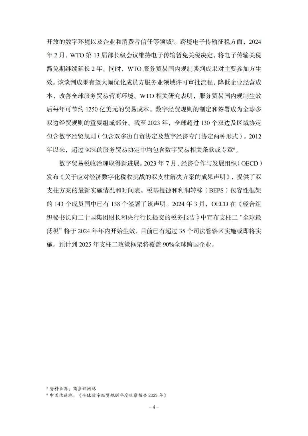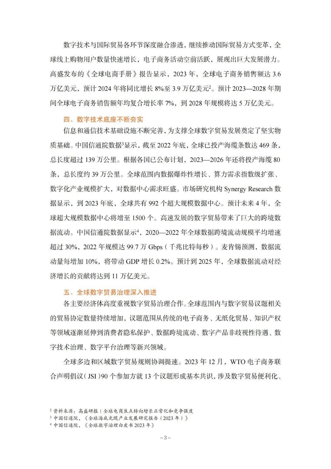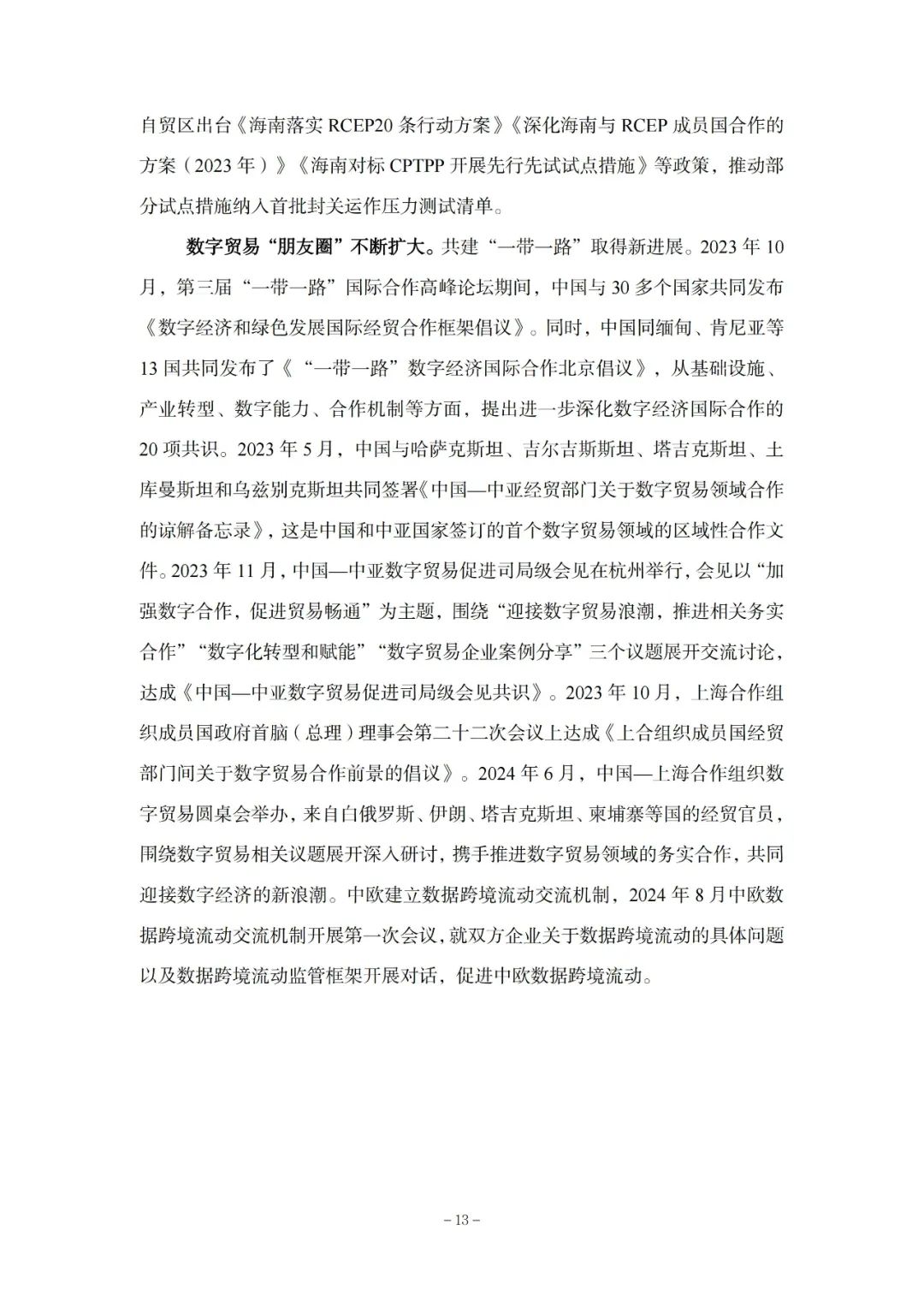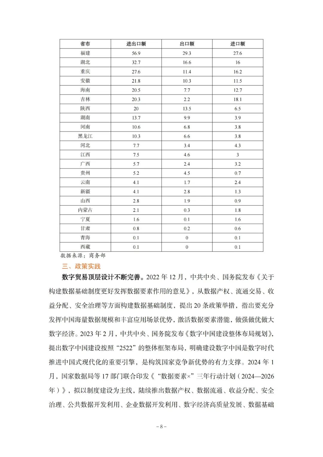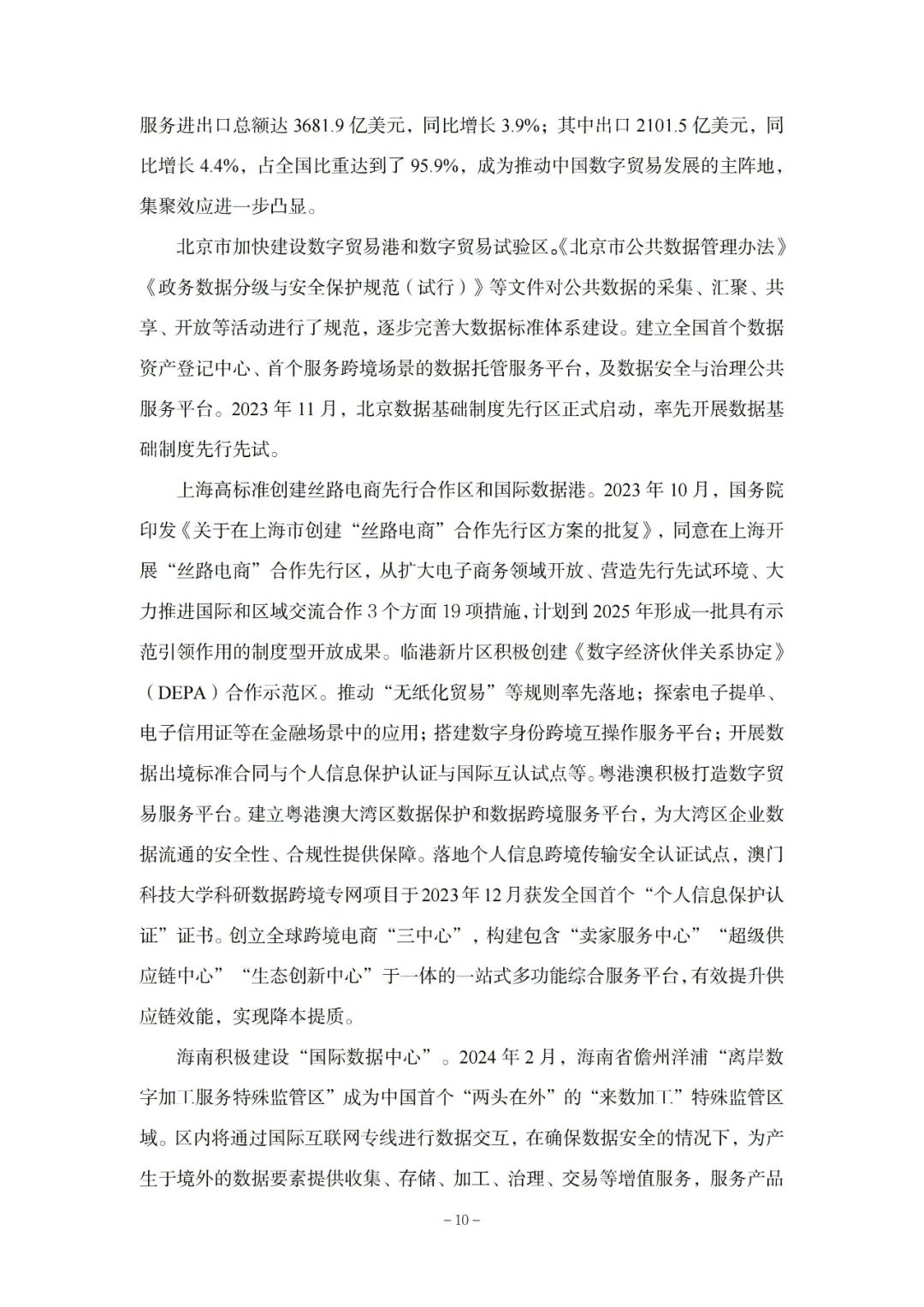 《中国数字贸易发展报告 2024》对 2023年以来中国数字贸易发展的主要成果,发展动向、行业趋势、政策实践等进行分析,为加强形势研判、抢抓发展新机遇、推动数字贸易改革创新、谋划开放合作提供参考。
