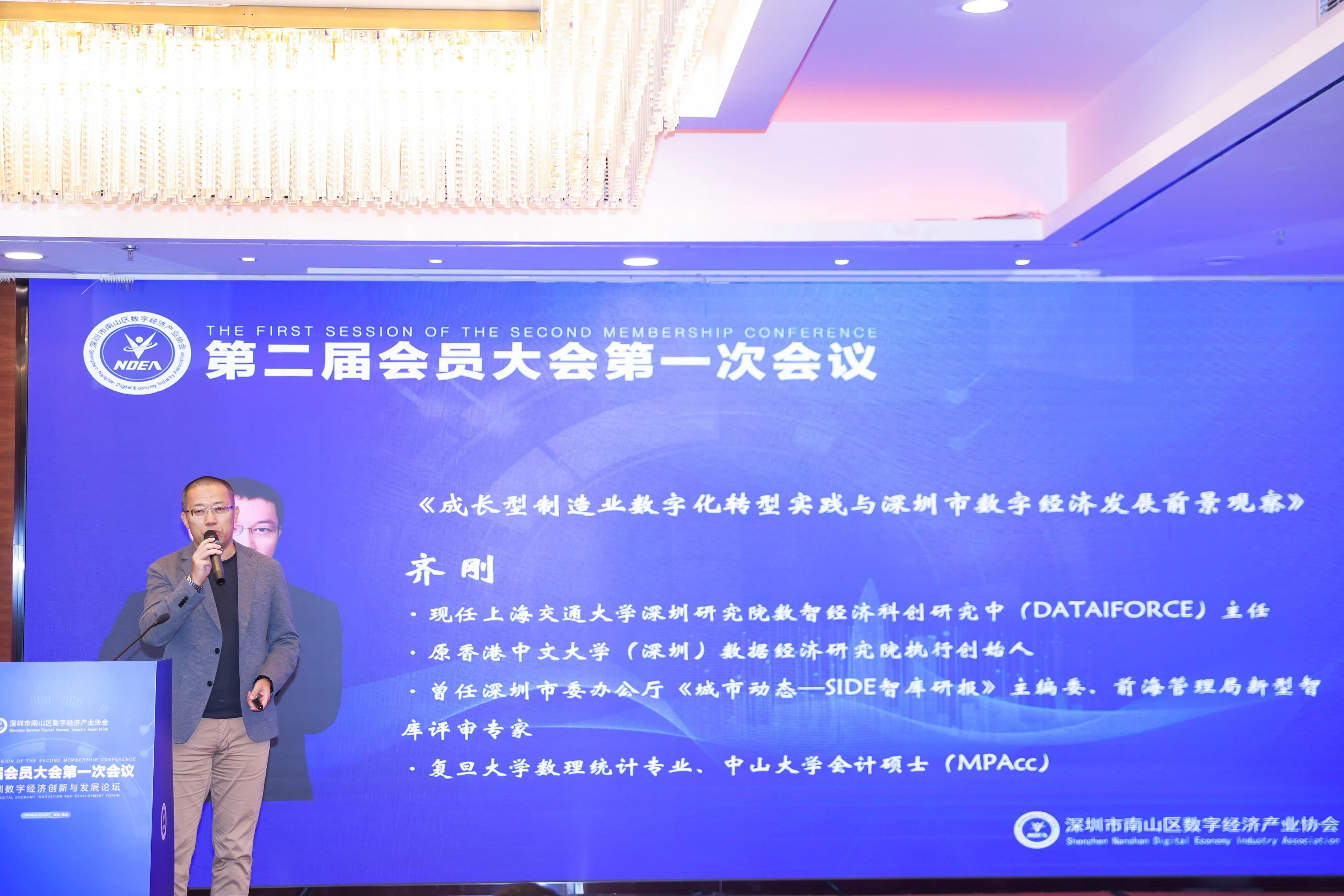 此次大会特别邀请了上海交通大学深圳研究院数智经济科创研究中心(DATAIFORCE)主任、联合创始人、实践副研究员齐刚进行《成长型制造业数字化转型实践与深圳市数字经济发展前景观察》主题分享,齐主任以其深厚的学术背景和丰富的实践经验,深入剖析了制造业在数字化浪潮中的转型路径,并对深圳市数字经济的未来发展趋势进行了前瞻性的展望。他的见解不仅为与会者提供了宝贵的知识财富,也为深圳市数字经济的未来发展指明了方向。