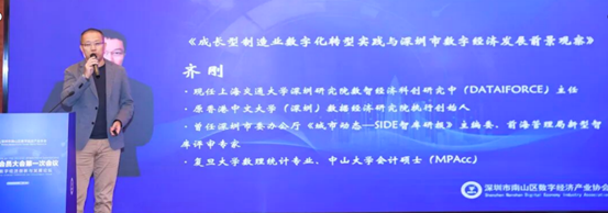 大会特别邀请了上海交通大学深圳研究院数智经济科创研究中心(DATAIFORCE)主任、联合创始人、实践副研究员齐刚进行《成长型制造业数字化转型实践与深圳市数字经济发展前景观察》主题分享,齐主任以其深厚的学术背景和丰富的实践经验,深入剖析了制造业在数字化浪潮中的转型路径,并对深圳市数字经济的未来发展趋势进行了前瞻性的展望。他的见解不仅为与会者提供了宝贵的知识财富,也为深圳市数字经济的未来发展指明了方向。