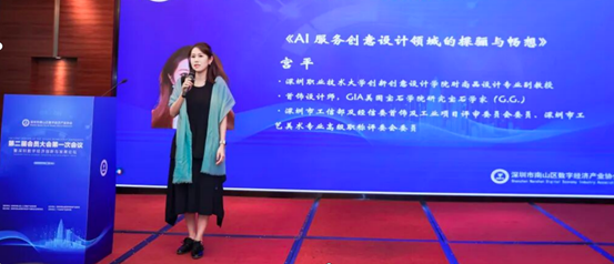 深圳职业技术大学创新创意设计学院时尚品设计专业副教授宫平教授在第二场主题演讲中,探讨了人工智能技术在创意设计领域的应用与发展前景。她从AI技术的角度出发,深入探讨了如何通过技术创新激发创意产业的新活力,并对未来AI在创意设计领域的应用进行了畅想。