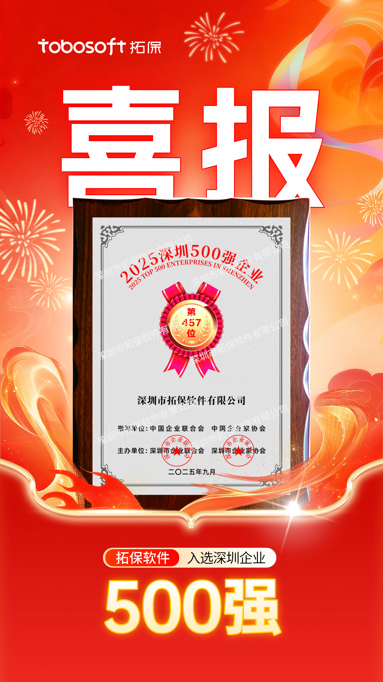 2025年10月28日,深圳市企业联合会、深圳市企业家协会联合前瞻产业研究院正式发布“2025深圳企业500强榜单”及《2025深圳500强企业发展报告》。拓保软件凭借稳健的经营业绩、突出的创新实力与扎实的行业口碑,成功入选500强榜单,与中国平安、华为、比亚迪等行业领军企业同列,跻身深圳高质量发展企业阵营,这也是权威机构对公司规模、创新能力、社会贡献及发展潜力的全面认可。
